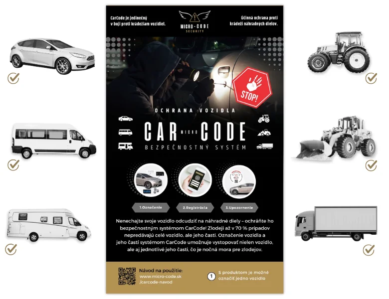 70 % odcudzených vozidiel sa predáva na súčiastky. Vozidlo môže mať evidenčné číslo, číslo motora a karosérie – ale ostatné časti nie sú označené. Práve v tomto prípade pomáha sada bezpečnostného značenia CarCode, vďaka ktorému je vozidlo pre zlodejov bezcenné.