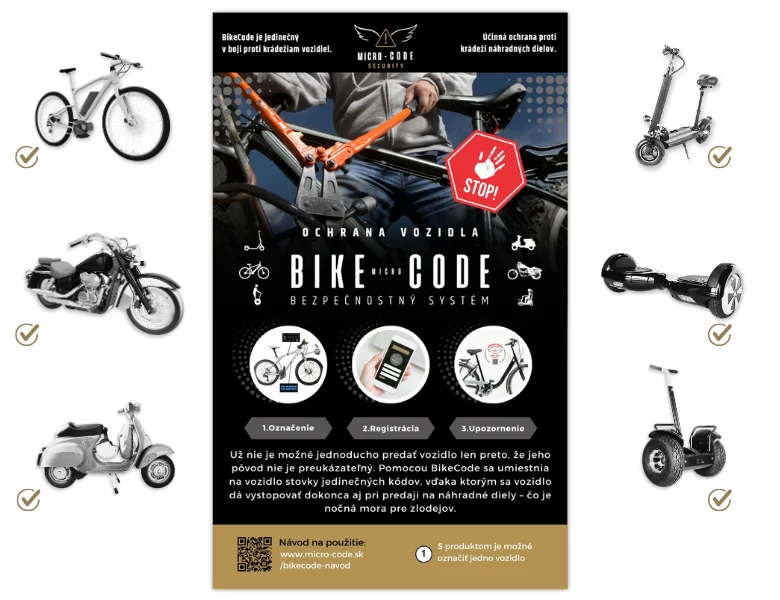 Väčšina dvojkolesových vozidiel nemá evidenčné číslo a ich výrobné číslo nemusí byt jedinečné. Pomocou sady BikeCode je možné označiť rám a iné časti bicyklov alebo motoriek a vďaka množstvu nanesených kódov sa stanú identifikovateľné a vysledovateľné.