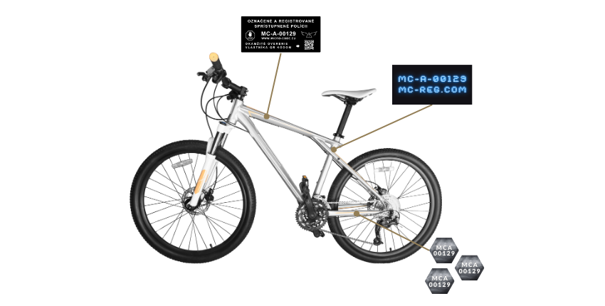 Pri produkte BikeCode používame tri typy bezpečnostného značenia: označenie mikrobodkami, vyleptanie rámu viditeľne iba pod UV svetlom a označenie deštruktívnou nálepkou.
