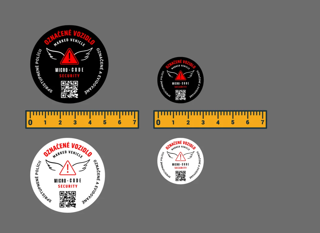 Jedna nálepka má priemer 5 cm a druhá 3 cm. V prípade vozidiel s kódom CarCode sa obe veľkosti ľahko aplikujú, – v prípade vozidiel s kódom BikeCode sa v niektorých prípadoch ľahšie aplikujú nálepky s priemerom 3 cm.
